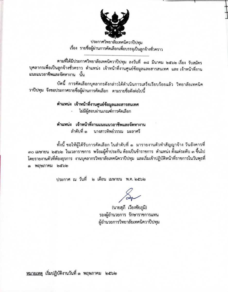 ประกาศวิทยลัยเทคนิควาปีปทุม เรื่อง รายชื่อผู้ผ่านการคัดเลือกเพื่อบรรจุเป็นลูกจ้างชั่วคราว
