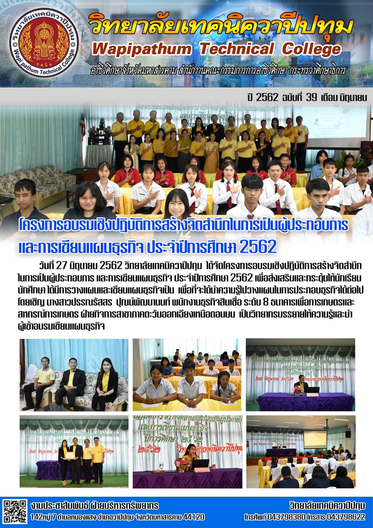 วิทยาลัยเทคนิควาปีปทุม จัดโครงการอบรมเชิงปฏิบัติการสร้างจิตสำนึกในการเป็นผู่้ประกอบการ และการเขียนแผนธุรกิจ ประจำปีการศึกษา 2562