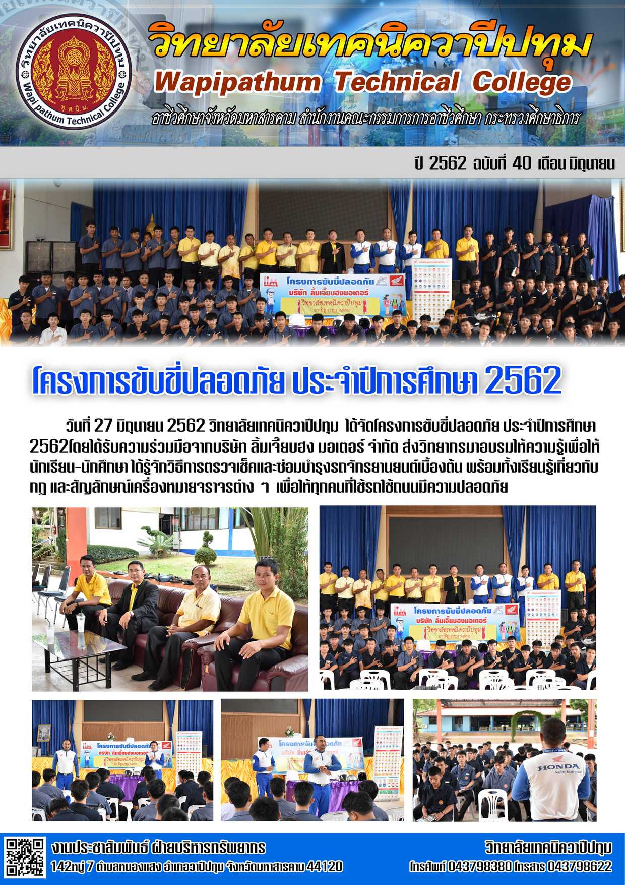 วิทยาลัยเทคนิควาปีปทุม ได้จัดโครงการขับขี่ปลอดภัย ประจำปีการศึกษา 2562
