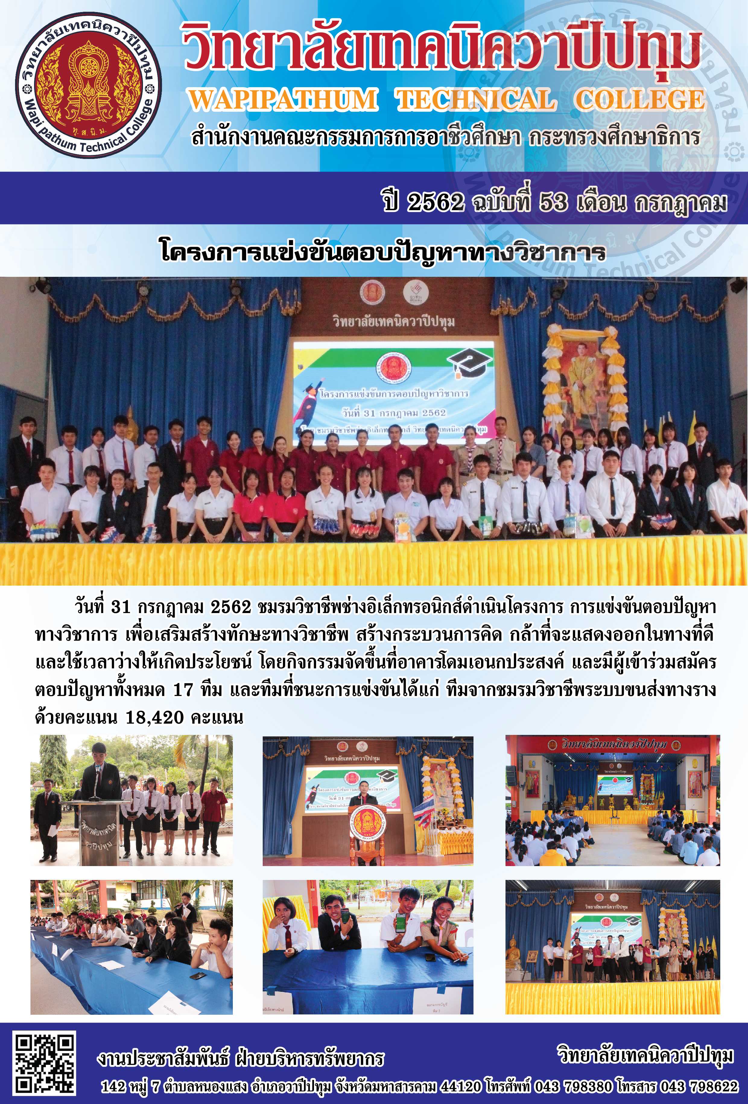 วิทยาลัยเทคนิควาปีปทุม จัดโครงการแข่งขันตอบปํญหาทางวิชาการ เพื่อเสริมสร้างทักษะทางวิชาชีพ สร้างกระบวนการคิด กล้าที่จะแสดงออกในทางที่ดีและใช้เวลาว่างให้เกิดประโยชน์