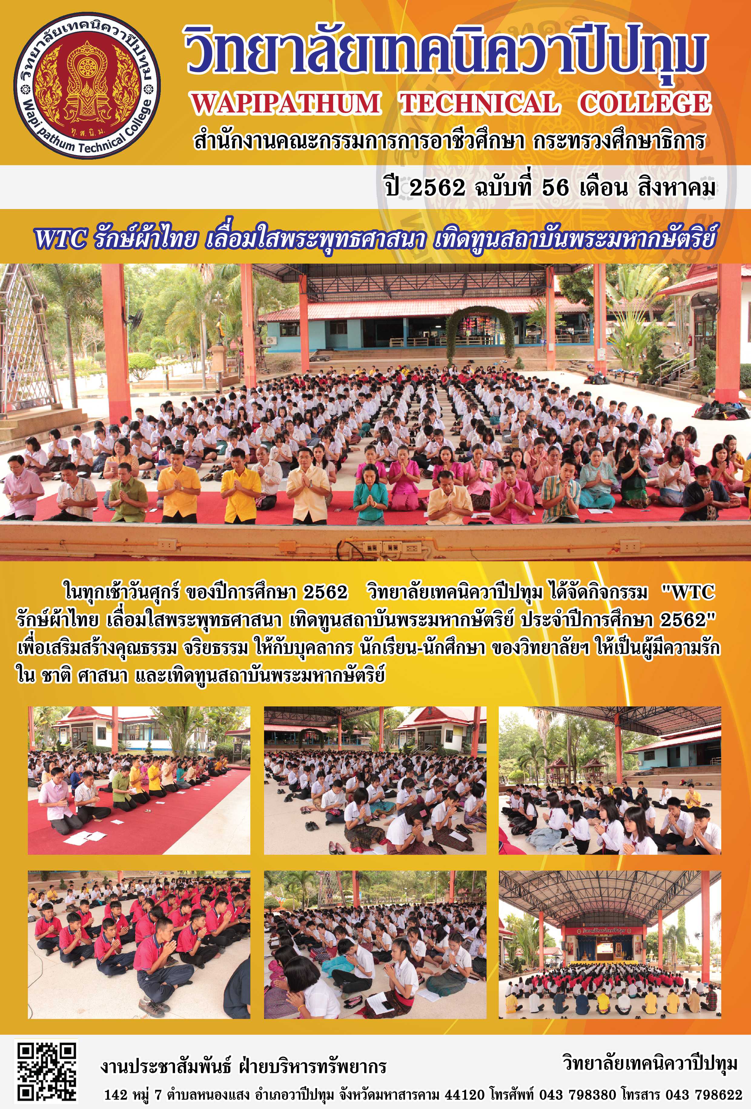 วิทยาลัยเทคนิควาปีปทุม จัดโครงการ WTC รักษ์ผ้าไทย เลื่อมใสพระพุทธศาสนา เทิดทูนสถาบันพระมหากษัตริย์ ในทุกเช้าวันศุกร์ ของปีการศึกษา 2562
