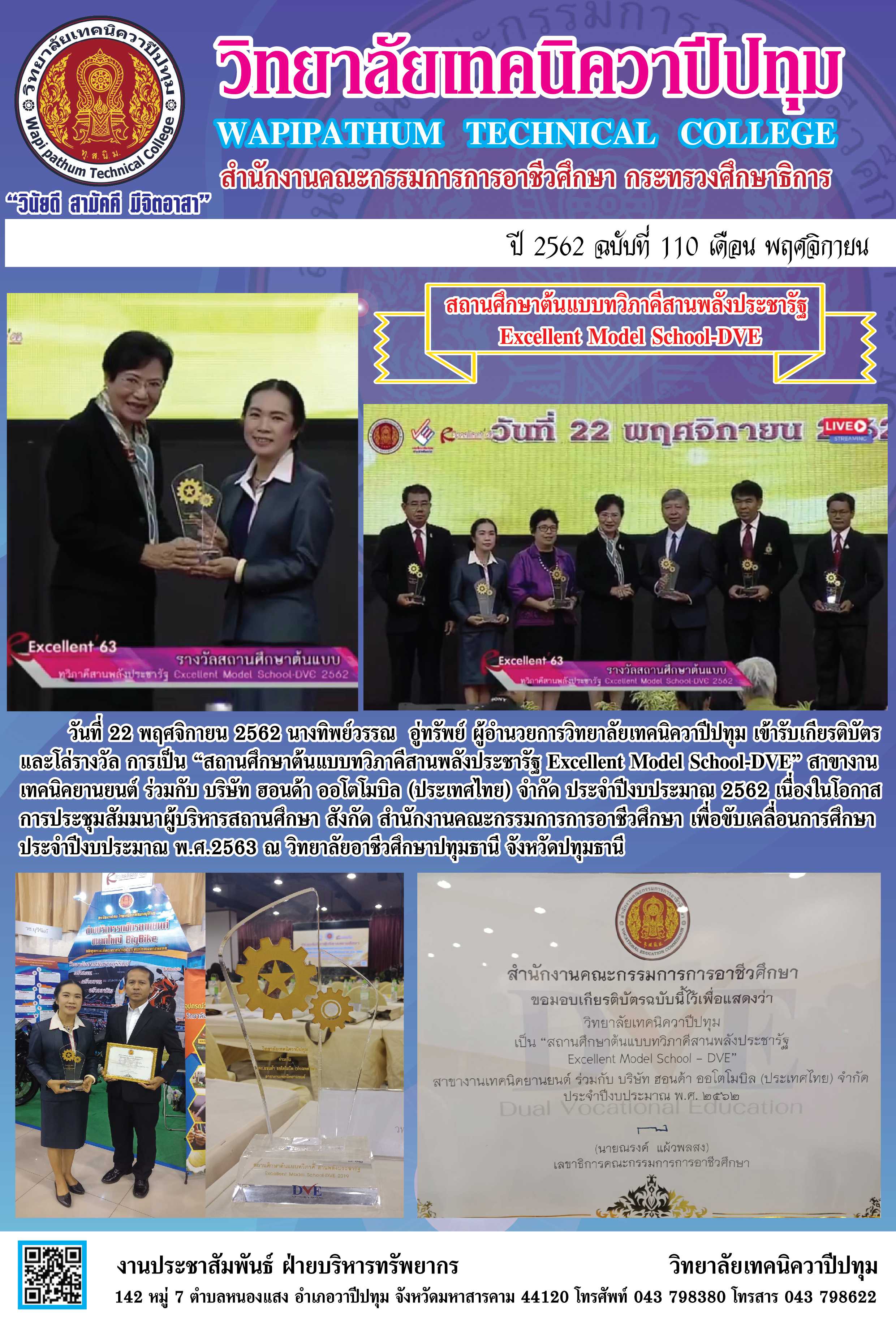 วิทยาลัยเทคนิควาปีปทุม เข้ารับเกียรติบัตร และโล่รางวัล การเป็นสถานศึกษาต้นแบบทวิภาคีสานพลังประชารัฐ Excellent Model School-DVE สาขางานเทคนิคยานยนต์ ร่วมกับ บริษัท ฮอนด้า ออโตโมบิล (ประเทศไทย) จำกัด