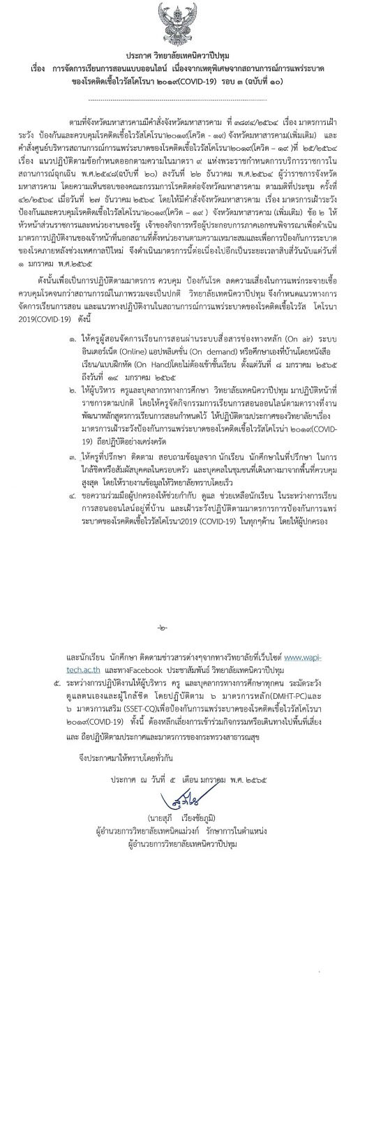 ประกาศ วิทยาลัยเทคนิควาปีปทุม เรื่อง การจัดการเรียนการสอนแบบออนไลน์ เนื่องจากเหตุพิเศษจากสถานการณ์การแพร่ระบาด ของโรคติดเชื้อไวรัสโคโรนา 2019(COVID-19) รอบ 3 (ฉบับที่ 10)