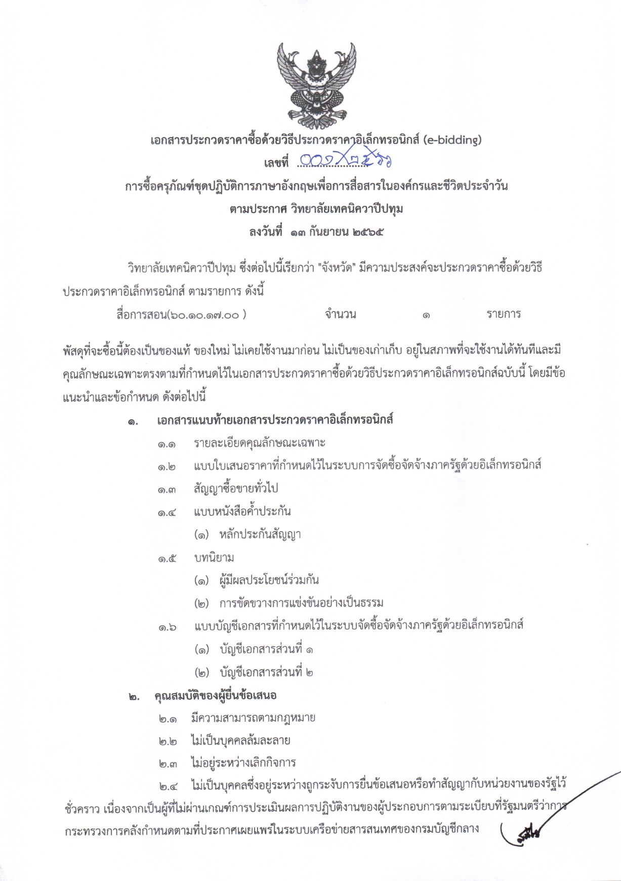 เอกสารประกวดราคาซื้อด้วยวิธีประกวดราคาอิเล็กทรอนิกส์ (e-bidding) การซื้อครุภัณฑ์ชุดปฏิบัติการภาษาอังกฤษเพื่อการสื่อสารในองค์กรและชีวิตประจำวัน