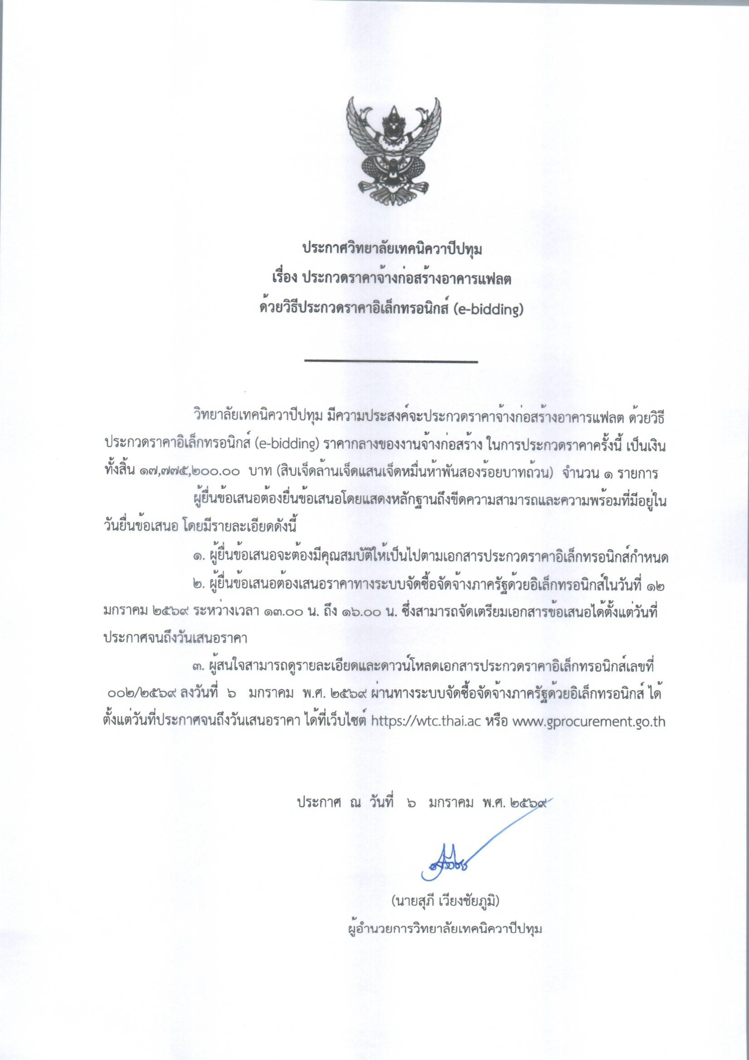 ประกาศวิทยาลัยเทคนิควาปีปทุม เรื่อง ประกวดราคาจ้างก่อสร้างอาคารแฟลต ด้วยวิธีประกวดราคาอิเล็กทรอนิกส์ (e-bidding)