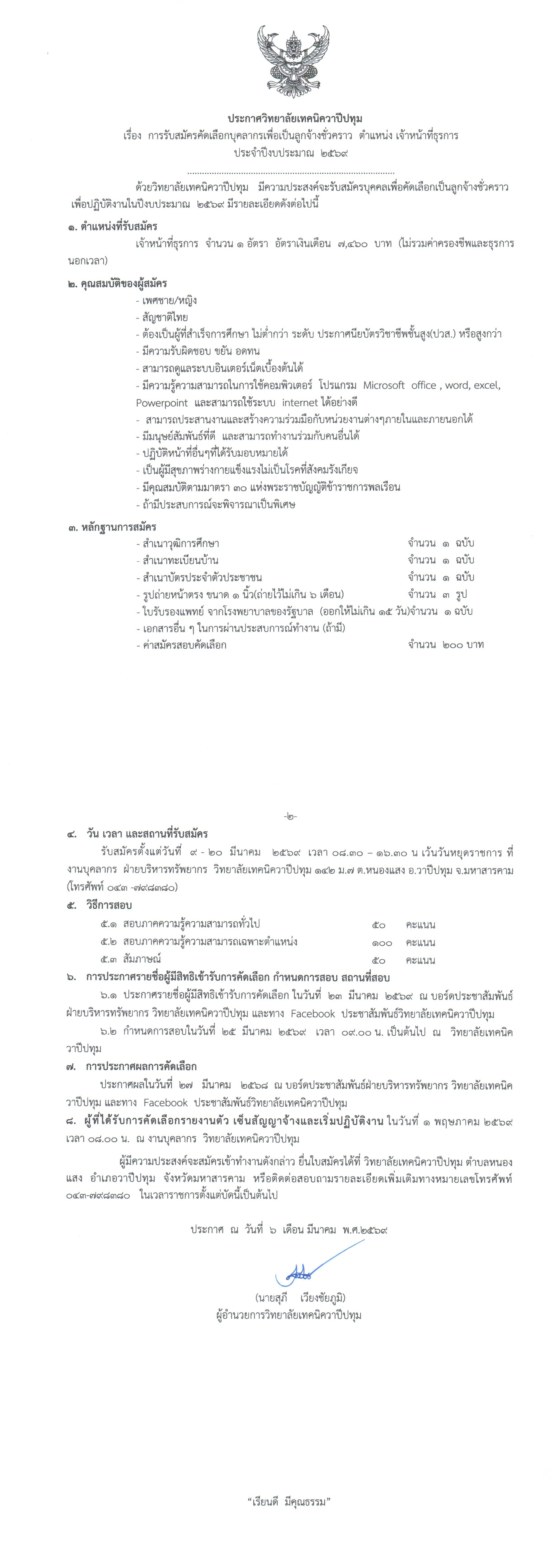 ประกาศวิทยาลัยเทคนิควาปีปทุม เรื่อง การรับสมัครคัดเลือกบุคลากรเพื่อเป็นลูกจ้างชั่วคราว ตำแหน่ง เจ้าหน้าที่ธุรการ